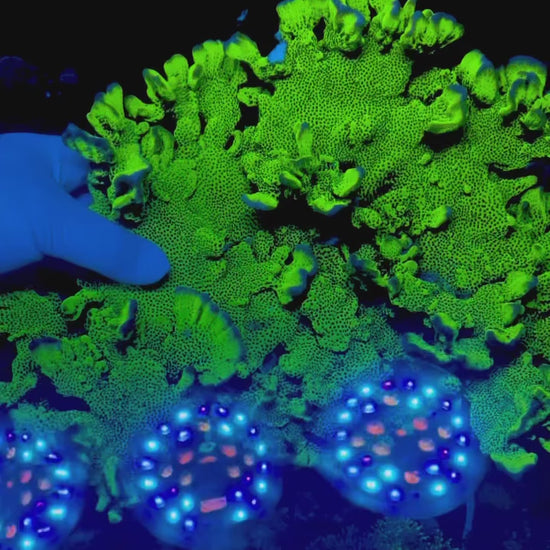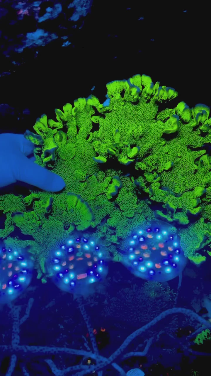 Moderate to high light works best. Around 150 to 250 PAR keeps the green base vivid and the purple or blue growth ridges sharp. Under very strong light you get tighter growth and stronger color separation.