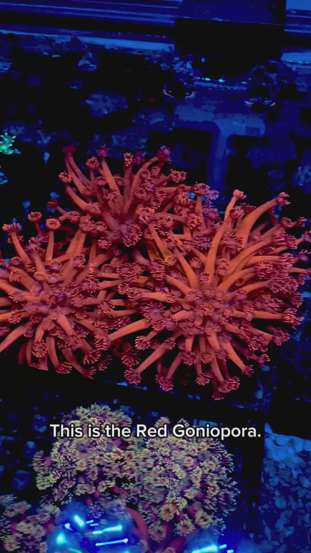 Moderate light is ideal, usually 80 to 150 PAR. Too little and the red loses intensity. Too much and the polyps shorten or retract. Goniopora color up beautifully under balanced spectrums rather than extreme high-intensity blue.